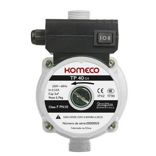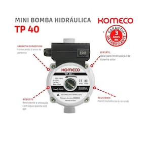 A Mini Bomba Hidraúlica 127V 60HZ G4 TP40 Ferro da Komeco é para uso em sistema solar e recirculação em sistemas fechados. Indicado para uso direto em aquecedores de passagem, sistema solar e recirculação em sistemas fechados. Silenciosa; Sistema de fácil instalação; Ideal para recirculação de sistema solar Resistente à utilização com água quente até 90C.