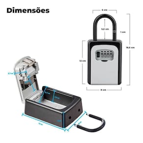 O corpo do Cadeado Cofre para Guardar Chaves é em aço, proporcionando durabilidade e segurança. Ele pode ser fixado em qualquer estrutura que a parte do cadeado consiga abraçar, como grades, maçanetas de portas ou até de carros. Ele pode também ser fixado na parede, mas não acompanha os parafusos de fixação. A combinação de segurança é de 4 dígitos, e mais de 10.000 variações de códigos.