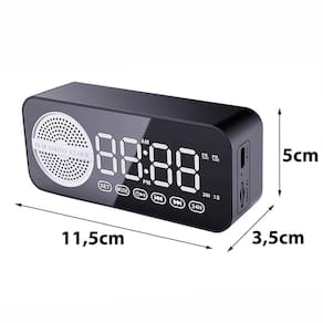 - Modelo: Mini Caixa de Som Relógio - Material: Plástico, Componentes Elétricos. - Potência: 3W - Radio: Fm/Am - Alimentação de Energia: Cabo USB Bivolt - Dimensões Aprox.: 11,5cm X 5cm X 3,5cm