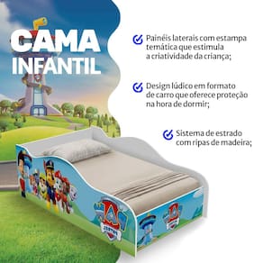 CARACTERÍSTICAS TÉCNICAS Tipo: Mini Cama Infantil Modelo: Carro Estampa Adesivada Adesivo: Patrulha Canina Cor da Estrutura: Branco Painéis laterais com acabamento adesivado temático; Design em formato de carro, laterais elevadas para maior proteção; Sistema de estrado com ripas de madeira; Colchão com espuma de densidade D18;