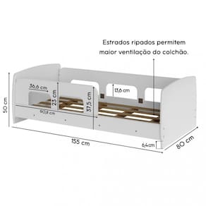 Características: Estrutura em MDP/MDF Estrado de madeira maciça Cantos arredondados Suporta até 120 kg Colchão recomendado: 150 x 70cm Não acompanha colchão