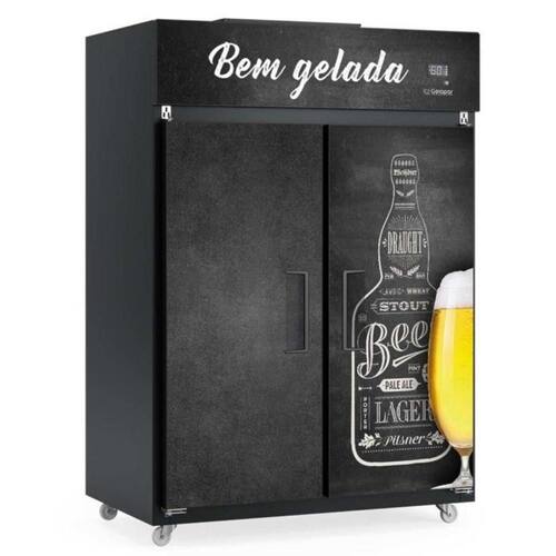 Características Técnicas: Conservação e exposição de cervejas e bebidas Refrigeração: ar forçado com evaporador aletado Temperatura: -6 a 3C Degelo: automático Controlador eletrônico com indicador de temperatura Revestimento interno: aço galvanizado Revestimento externo: aço pré-pintado preto Portas: cegas Fechamento automático e trava de abastecimento Prateleiras com 4 níveis, aramadas Gabinete com rodízios e travas Construção do Gabinete: monobloco Estrado em PVC na base Consumo: 9,15 kW/dia Capacidade líquida: 1421 litros Equipamento certificado conforme Portaria Inmetro n 371/2009 Imagens meramente ilustrativas. **