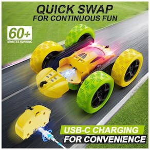 O Carro de Acrobacias RC QUNREDA foi atualizado com Módulos de Bateria Recarregáveis! Ele possui 2 módulos de bateria recarregáveis, um no corpo do carro e outro na embalagem para uso alternado. Os módulos de bateria são removíveis, proporcionando mais segurança e praticidade para recarregar e brincar. Cada módulo suporta 25 minutos de jogo, totalizando 50 minutos! Com apenas dois botões no controle, é possível realizar 9 acrobacias diferentes. Além disso, o carro pode girar 360° em ambos os lados enquanto se move. Com alcance de 50 metros, o carro estará sempre à vista. Equipado com faróis vermelhos e pneus duráveis, o carro oferece resistência a impactos, aderência e estabilidade. Perfeito para interiores e exteriores. O pacote inclui: 1 Carro RC, 1 controle remoto, 2 módulos de bateria recarregáveis, 2 pilhas AA, 1 cabo de carregamento, 1 chave de fenda e 1 manual do usuário. Ideal como presente de Halloween, Natal ou aniversário para meninos e meninas!