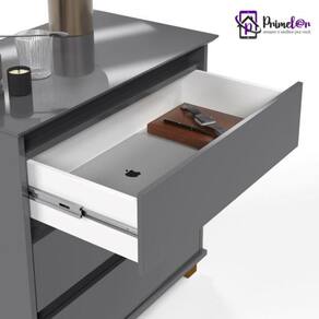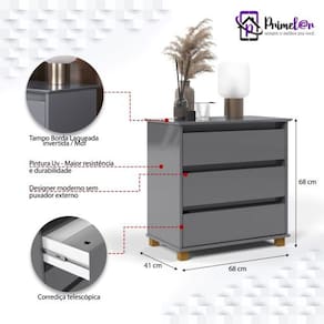 A Mini Cômoda EJ é um móvel versátil e funcional, possui acabamento UV e alto relevo, 03 gavetas sem puxadores externos para armazenar seus objetos, pés em madeira maciça e corrediças telescópicas. Um móvel produzido com material de qualidade, com design inovador e estrutura robusta para quem busca elegância e funcionalidade em um único produto.