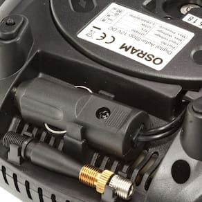 O OSRAM Tyreinflate 450 pode inflar um pneu de furado em 3,5 minutos**. Vem com recurso de parada automática para obter com precisão a pressão desejada para o seu pneu. Inclui um display digital retroiluminado e luz LED branca para iluminação ideal na escuridão. O design plano e sólido do Tyreinflate 450 torna a unidade estável enquanto estiver em uso, assim como o cabo de vento eliminando quaisquer fios bagunçados e ajudando você a voltar para a estrada mais rápido, também possui um mecanismo de enrolamento / descontaimento para cabo bem enrolado. Vem completo com kit adaptador de três peças para pneus de bicicleta, bolas e outros infláveis. **com base na inflação de um pneu de 13" de furado para 2,41 BAR
