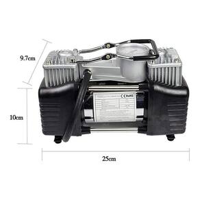 O mini compressor portatil é ideal para encher pneu com até 35libras Após o uso por mais de 10 minitos é obrigatorio deixar o mesmo esfriar, para começar uma nova calibragem Características: -tensão máxima: 12V C. Contínua - Pressão máxima: 150 libras - Vazão máxima: 85 litros / min - Quantidade de pistões: 02 - Manômetro - Mangueira espiral de 2,5 metros - Cabos de ligação com 2.5 metros - Corpo em alumínio fundido - Bicos universais - Maleta para transporte