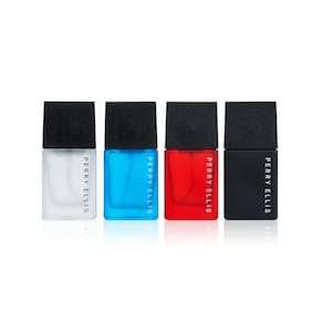 Mini conjunto masculino de café Perry Ellis de 4 peças — 4 aromas distintos e sensuais para qualquer ocasião. Encontre seu sabor para o dia: aquático, amadeirado, picante, fresco