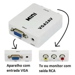 O produto é um conversor VGA para RCA. Não funciona ao contrário.Entra VGA (Dispositivos/Aparelhos) e sai RCA (Tela/Tv/Monitor)Não é recomendado para videogames e nem Chromecast.Converta o sinal VGA para AV RCA com esse compacto e elegante conversor com áudio. Com tecnologia Plug and Play, basta você conectar a sua saída VGA a uma entrada áudio e vídeo RCA e o cabo USB de alimentação.EspecificaçõesLargura de banda de freqncia: 165 mhzPorta de entrada: 1 x vgaPorta de sada: 1 x avFonte de alimentao usbModelo do corpo humano da proteo do esd: 88kv (descarga do ar-gap) Kkv (descarga de contato)Temperatura de funcionamento: 0 c 40 40 c/32 f 104 fTemperatura de armazenamento:-20 c 60 60 c/-4 f 140 fUmidade relativa: 20 rh 90% rh (no-condensao)Consumo de potncia: (mximo) 2.5 w (mximo)Dimenses: (mm) 66 (d) x 55 (w) x 20 (h)Contedo Do pacote:1 x vga ao conversor av1 x Cabo USB