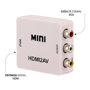 Mini Conversor Hdmi Para Vídeo Composto rca Ligue seu video game, notebook, dvd, sistema de câmeras, ou quaquer outro dispositivo que possua saída HDMI diretamente em televisores ou monitores que ainda utilizam a entrada AV Composite RCA com facilidade utilizando esse Mini Conversor HDMI para Vídeo Composto RCA . Tenha imagens nítidas e com qualidade de áudio. Imagens Full HD de 1080p. Basta ligar o cabo HDMI na porta de entrada do conversor, e, em seguida, ligue um cabo de Áudio e Vídeo Composto padrão RCA-amarelo, vermelho e branco do conversor para a TV. É necessário ligar o cabo USB já incluso para fornecimento de energia.