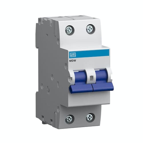 Mini Disjuntor Bipolar MDW-C50-2 50A CURVA C 5KA WEG O Mini Disjuntor Bipolar MDW-C50-2 50A CURVA C 5KA WEG, proporciona as aplicações mais segurança e economia, pois protege os cabos e fios contra sobrecargas de energia. Sua curva C, tem disparo instantâneo para correntes de 5 a 10 vezes a corrente nominal, conforme a norma NBR NM 60898 e NBR IEC 60947-2. Além do seu excelente custo benefício, possui bloco de contatos auxiliares, trava cadeado e barramento de distribuição bipolar.