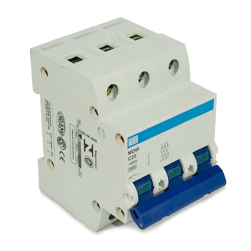 Mini Disjuntor Tripolar MDW-C20-3 20A CURVA C 5KA WEG O Mini Disjuntor Tripolar MDW-C20-3 20A Curva C disparo de 5 A 10 x in 5KA Weg, é tripolar, muito seguro e com um excelente custo benefício. Atende características de disparo B e C, conforme a norma NBR NM 60898 e NBR IEC 60947-2. A principal característica do Mini Disjuntor MDW-C80-3 80 Acurva C 5kA Tripolar, é o seu disparo instantâneo para correntes entre 5 a 10 vezes a corrente nominal. São aplicadas na proteção dos circuitos como instalação de cargas indutivas, como por exemplo, lâmpadas fluorescentes e máquinas de lavar.