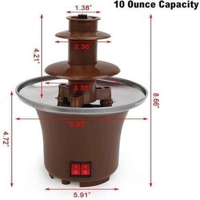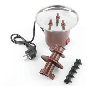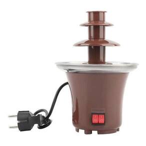 Mini Fonte De Chocolate Fondue Em Cascata De 3 Andares Voltagem: 220V Mini máquina de fondue cascata de chocolate Contém corpo compacto e é muito fácil de usar, basta ligar na tomada, em uma entrada de dois pinos. Agora é colocar o chocolate já derretido em sua base e ligar o motor. O chocolate é impulsionado através da torre, gerando um formato de cascata.