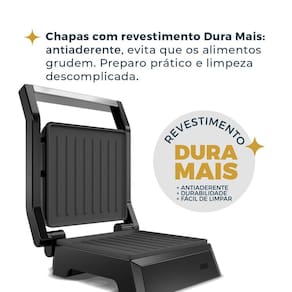 As chapas aquecem uniformemente, proporcionando uma tostagem perfeita em todos os lados, e o revestimento Dura Mais evita que os alimentos grudem, tornando o preparo e a limpeza mais simples.