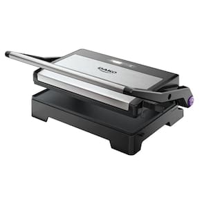 Mini Grill Dako 2 em 1 – Inox, 1000W é prático e versátil, possui grelhas antiaderentes (lisa e ondulada), ajuste de altura e alça fria ao toque, ideal para preparar até 2 sanduíches médios de uma vez. Aberto em 180°, transforma-se em chapa plana, comportando até 4 sanduíches ou diversos alimentos ao mesmo tempo. Compacto, pode ser guardado na vertical com trava de segurança, garantindo economia de espaço e praticidade na cozinha.