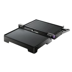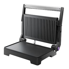 2, Aberto em 180° (modo chapa plana), tem capacidade de até 4 sanduíches médios