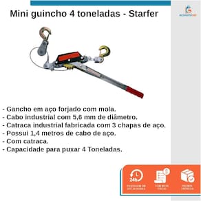 O Mini Guincho é ideal para mover equipamentos pesados, apertar cercas, remover árvores, troncos e obstáculos, ajudar no carregamento de barcos e trailers, e livrar veículos encalhados. Produzido com 3 chapas de aço que garante melhor resistência e durabilidade.CARACTERÍSTICAS TÉCNICAS:Material: Aço Galvanizado e Cabo EmborrachadoMaterial dos Ganchos: Aço ForjadoMedidas: 5,6mm (diâmetro cabo) x 1,4m (comprimento)Capacidade para puxar: 4000KgCapacidade para suspender: 1000KgMarca: StarferRef.: 9285016