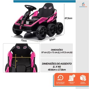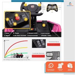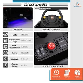 Benefícios: Segurança e Controle: Controle remoto incluso, permitindo que os pais acompanhem a direção do kart. Experiência de Condução Realista: Equipado com quatro motores de 24V, proporcionando desempenho de alta qualidade. Diversão Completa: Com suporte para MP3, as crianças podem curtir suas músicas favoritas enquanto brincam. Estrutura Robusta e Estável: Projetado para suportar até 50 kg, com design que proporciona segurança em terrenos variados.