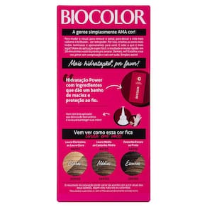 Conteúdo da embalagem: 1 bisnaga de coloração creme 50g. 1 frasco aplicador de emulsão reveladora condicionante 30 Volumes 50ml. 1 sachê de máscara de tratamento condicionante 10g. 1 par de luvas. Sobre a marca: A Tintura BIOCOLOR foi criada especialmente para proporcionar uma cor intensa e radiante, trazendo o tom e proteção que o cabelo merece. BIOCOLOR acredita no poder da transformação. Quando mudamos a cor do cabelo, outras mudanças acontecem em nossa vida e nós incentivamos você a vive-las intensamente!