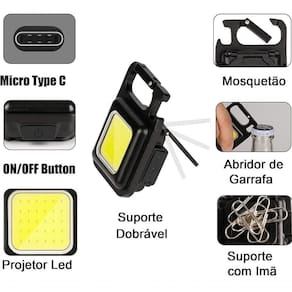 - Lanterna Led Super brilhante: O chaveiro lanterna tem um poderoso LED que pode fornecer até 800 lumens de iluminação, mantendo um tamanho portátil e design simples.- 3 modos de iluminação: lanterna/chaveiro possui 3 modos de iluminação modo alto, modo baixo, modo estroboscópio.- Design portátil: A base poderosa do ímã e o punho rotativo permitem que você liberte suas mãos durante o trabalho. O design do ímã permite que a lanterna seja unida a qualquer metal, e o punho dobrável de 180 permite que a lanterna seja colocada em ângulos diferentes ou pendurada em determinados lugares.- USB recarregável: Quando você precisa carregar, basta conectá-lo a qualquer fonte de energia USB. Esta lanterna recarregável USB é alimentada por uma bateria recarregável embutida de grande capacidade, incluindo um micro USB ao cabo de carregamento USB.- Amplamente utilizado: Lanterna de bolso portátil com chaveiro, suporte dobrável, abridor de garrafa e suporte de ímã. para pesca, caminhadas e acampamento, manutenção de emergência na estrada ou trabalho multiuso, etc.Especificação:- Material: liga de alumínio- Tamanho: 6x4.2 Cm- Brilho: 800lm- Tempo de descarga: 3-8- Temperatura de cor: 6000-8000- Modo de iluminação: luz forte, luz baixa, flash- Vida: 100000 (h)- Potência da fonte de luz: 6(w)- Tensão: 3.7 (v)- Faixa de uso: iluminação ao ar livre- Resistente a chuva- Pesa somente 45g* O pacote inclui: - 1 Lanterna/Chaveiro Mosquetão- Acompanha cabo USB Type-C Cor: Preto