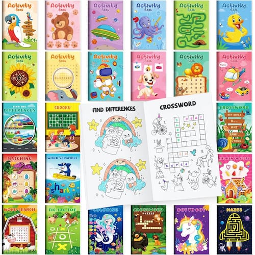 - O pacote inclui: você receberá 24 mini livros de atividades, impressão frente e verso. O jogo inclui labirinto, procure objetos ocultos, encontre as diferenças, coloração, quebra-cabeças, busca de palavras, embaralhamento de palavras, tic.tac.toe, ponto a pontos, etc. Deixe as crianças brincarem o dia todo