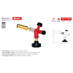 - Bico padrão - Bico estendido, metal - Acendimento automático - Compatível com qualquer refil de Gás do Mercado - Temperatura Máxima: 1.450°C - Tamanho: 160x110mm (CxA) - NÃO ACOMPANHA o gás