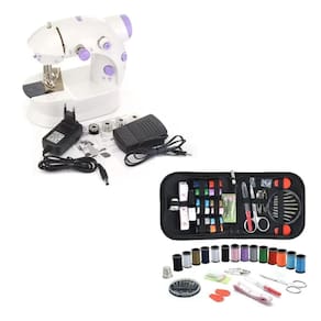 Mini máquina de costura portátil com kit de 27 itens, ideal para pequenos reparos, compacta e bivolt.Funções