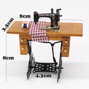 Mini máquina de costura com linha para mobília diminuta de madeira da casa de bonecas 1/12 Especificações: Material: metal, pano, madeira Tamanho: 8X4.4X8CM Coleção excelente da boneca, uma grande adição a toda a casa tradicional das bonecas Conformidade: casa de bonecas da escala 1/12 Pedal do metal (lá nunca é realmente costurar) detalhe do ouro, dois pequenos gavetas (as gavetas não estão abertas) em cada lado da mesa e uma máquina de metal preto. O pacote inclui: 1 máquina de costura em miniatura vintage