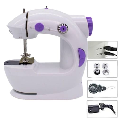 Quais acessórios estão incluídos na embalagem A embalagem inclui 01 mini máquina de costura, 01 fonte de energia com tomada, 01 pedal de acionamento, e 04 mini carretéis de linha.