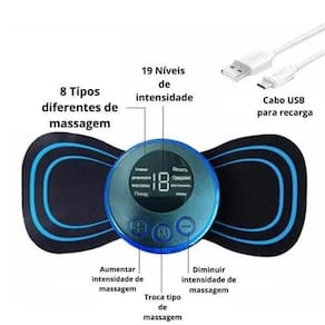 Especificações técnicas: - 8 modalidades - 19 intensidades - desliga automaticamente após 30 segundos sem contato com a pele - voltagem: 3,7v - saída máxima: 35maa - frequência: 1-100hz - capacidade da bateria: 200mah Marca: Massageador Portátil Recarregá