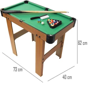 Acessórios incluídos: 2 tacos, 1 jogo de bolas, 1 triângulo, 1 giz, 4 pés de apoio, 1 escova
