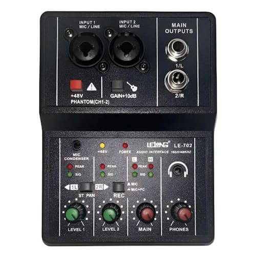 Mesa de Som C/Interface e Multipista 2 Canais Descrição Apresentamos a você a mais nova Mesa de Som com Interface de Audio que vem para facilitar ainda mais a sua vida de músico, Le702. Além do seu tamanho compacto, ela atende cantores que queiram fazer gravações de voz e violão, reviews, home stúdio, etc. Um Aparelho Compacto que Entrega o Melhor em Qualidade e Versatilidade em Uso Especificações: 2 entradas balanceadas XLR/P10 2 saídas L e R Power Entrada P3 para microfone condesador Função HI-Z Gravação em multitrack Saída para fone de ouvido Entrada Mic 1-2 balanceadas Resposta de frequência: -1/-1db, 20Hz-20KHz Faixa dinâmica: 82dB, ponderação A THD+N 0,03%, 1KHz Nível de entrada: +6dBu Resistência de entrada: 4 Ganho total: +3dB -+60dB Entrada HI-Z 2 desbalanceada Nível máximo de entrada: +3,0dbV Resistência de entrada: 1M Ganho total: 0dB -+40dB Entrada de linha 1/2 balanceada Nível máximo de entrada: +10dBu Resistência de entrada: -10dB -+40dB Saída principal equilíbrio de impedância Resposta de frequência: -1/-1db, 20Hz-20KHz Faixa dinâmica: 82dB, ponderação A THD+N 0,03%, 1KHz Nível máximo de entrada: +6dBu Resistência de entrada: 100 Marca: Não Informado