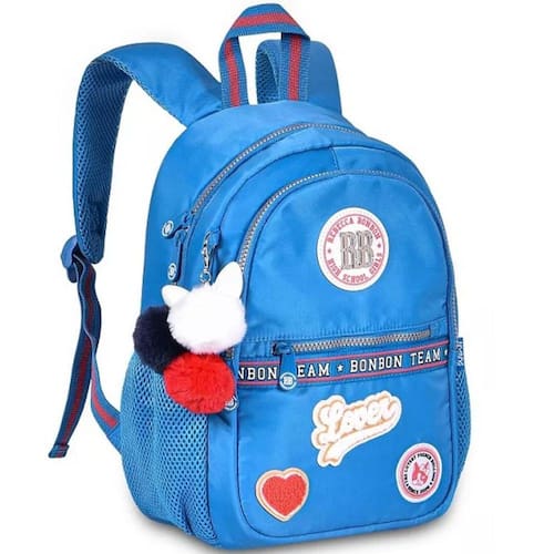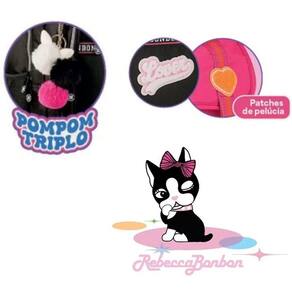 Mochila confeccionada em material soft, etiqueta de PVC com metal de RB e etiqueta de tecido, patches bordados atoalhados e com straps no painel frontal.