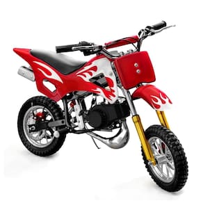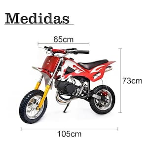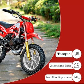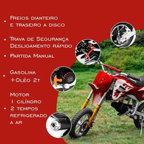 Mini moto 49cc 2 tempos a gasolina, recomendada para crianças de 4 a 9 anos, suportando até 60kg. Estrutura em aço com carenagem plástica, freios dianteiro e traseiro a disco e velocidade máxima de 40 km/h. Tanque de 1,5L. Vai quase pronta para uso, sendo necessário apenas instalar a roda dianteira e apertar alguns parafusos. Conta com dispositivo de segurança que desliga ao puxar a alça presa ao piloto.