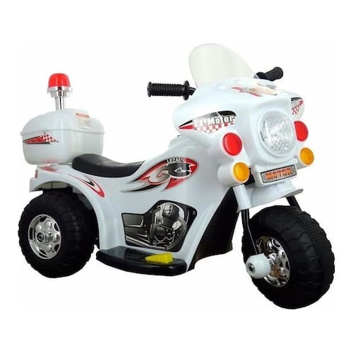 Função: frente e ré Sistema de acionamento: botão no pé Número de rodas: 3 Sistema de direção: guidão Assento: sim Apoio para os pés: sim Emite luzes: sim, farol e sirene Som de música: sim Porta objetos traseiro: sim