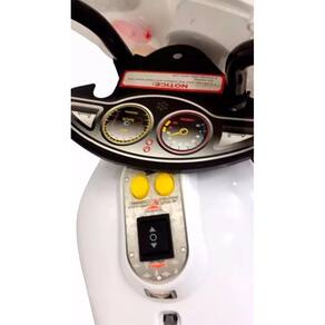 Função: frente e ré Sistema de acionamento: botão no pé Número de rodas: 3 Sistema de direção: guidão Assento: sim Apoio para os pés: sim Emite luzes: sim, farol e sirene Som de música: sim Porta objetos traseiro: sim
