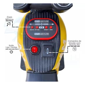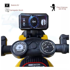 Conteúdo da Embalagem: - Inclui 1 Mini Moto Elétrica Amarela 6V com LED e Marcha Ré. - Produto pré-montado com manual de instruções.