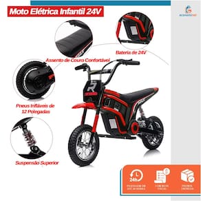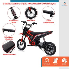 Benefícios: Segurança e Estabilidade: Estrutura robusta, suspensão eficiente e sistema de freio automático garantem uma experiência segura. Experiência Realista: Equipado com assento em eco-couro, luzes LED traseiras e sistema de música integrado, para uma experiência de pilotagem próxima à realidade. Controle Total: Acelerador e freio de mão integrados ao guidão, junto ao indicador de bateria, proporcionam controle completo da moto. Alta Performance e Durabilidade: Dois motores e rodas de 12 polegadas, ideais para aventuras prolongadas e controladas. Conforto e Estilo: Assento em eco-couro e sistema de música integrado garantem conforto e diversão.