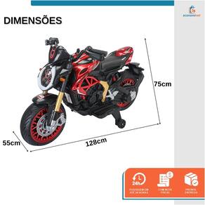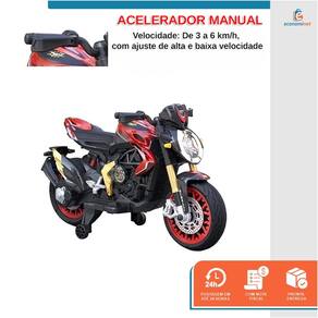 Características Principais: Modelo: Moto Racer Material: Plástico de alta qualidade Bateria: 12V 4.5Ah Velocidade: De 3 a 6 km/h, com ajuste de alta e baixa velocidade Movimento: Para frente e para trás Motor: Dois motores modelo 550 Peso Suportado: Até 30 kg Idade Recomendada: A partir de 3 anos Brilho nas Rodas: Design moderno e atraente. Áudio: Suporte para MP3, som de trombeta e músicas integradas. Iluminação: Luzes vibrantes para maior visibilidade.