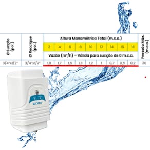 ALTURA MANOMÉTRICA x VAZÃO: - 02 M.C.A x 1.900L/H - 04 M.C.A x 1.700L/H - 06 M.C.A x 1.500L/H - 08 M.C.A x 1.300L/H - 10 M.C.A x 1.200L/H - 12 M.C.A x 1.000L/H - 14 M.C.A x 0.700L/H - 16 M.C.A x 0.500L/H - 18 M.C.A x 0.200L/H