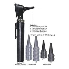 . Cabo com botão liga/desliga . Presilha em aço inoxidável . Cabeçote com lente acrílica de 2,5x de aumento . 05 espéculos pretos reutilizáveis nº 1 - 2,5mm . 04 espéculos pretos reutilizáveis nº 2 - 4,0mm . 10 espéculos cinzas descartáveis nº 1 - 2,5mm . 10 espéculos cinzas descartáveis nº 2 - 4,0mm . 01 lâmpada 2,5Volts . 01 estojo para acondicionamento