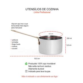 Contem: 1 Mini Panela Capacidade: 250 ml Medidas: 18,5 x 8,3 cm Material: Aço Inoxidavel Peso: 183 gramas Obs: Não é indicado o uso diretamente ao fogo.