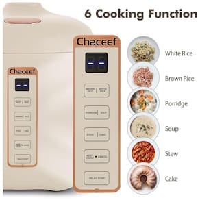 Controle inteligente e 6 funções de cozimento esta máquina de arroz multifuncional possui 6 funções de cozimento arroz branco, arroz integral, mingau, sopa, ensopado e bolo que podem atender às suas diferentes necessidades de cozimento. Através do painel de controle inteligente, você pode selecionar facilmente diferentes funções de cozimento com tempos de cozimento correspondentes.