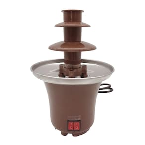 Fonte de fondue de chocolate de 3 camadas carrega chocolate branco ou marrom derretido da base ao topo da torre. Ele mantém o chocolate derretido com uma base aquecida que o mantém aquecido e fluindo. É o tamanho perfeito para pequenas reuniões e é um ótimo presente para os entusiastas do chocolate.