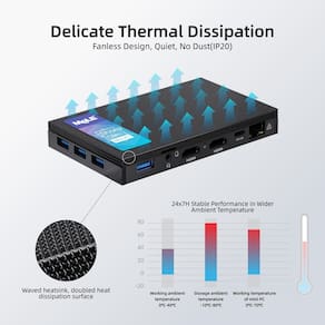 - Design elegante de resfriamento sem ventilador - Este PC sem ventilador possui um sistema de resfriamento passivo que evita o superaquecimento. Oferece um ambiente de computação silencioso e estável, suporta operação 24 horas por dia, 7 dias por semana. Embora seu design exclusivo garanta resistência à poeira e operação silenciosa, observe que os mini PCs sem ventilador terão uma temperatura de superfície de 55 °C a 70 °C, que é mais quente do que a temperatura da caixa dos mini PCs tradicionais resfriados por ventilador, mas atende aos padrões de segurança da International Electrotechnical IEC62368-1:2018.