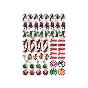 Incremente sua decoração com a presença dos maiores heróis! Apresentamos o Mini Personagem Decorativo Avengers - Kit com 62 Unidades.