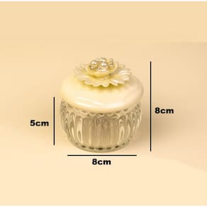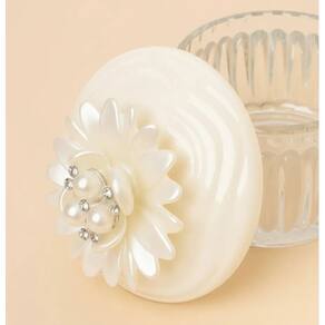 Encantador porta-joias feito em vidro transparente com delicadas ranhuras que refletem a luz com elegância. A tampa, em tom perolado, é adornada com uma linda flor em camadas e detalhes de pérolas e strass, adicionando um toque sofisticado e romântico. Ideal para guardar anéis, brincos e pequenos acessórios, ou até mesmo para decorar penteadeiras e mesas de cabeceira ou ainda presentear com charme e bom gosto.