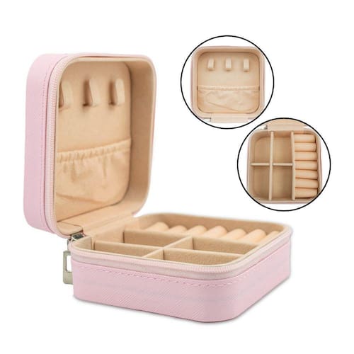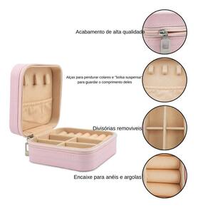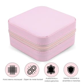 Características Principais: - Costura e acabamento de alta qualidade; - Zíper de metal resistente; - Possui duas divisórias que podem ser removidas uma a uma; - Ganchos de tecido que separam os colares; - Bolsa acoplada na tampa para suas joias não se emaranharem; - Divisórias para anéis e argolas; - Pequeno e portátil, podendo ser utilizado em viagens; - Interior em tecido, evitando que as joias manchem ou arranhem.