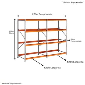 Mini Porta Pallet 1500kg 1 Inicial 1 Continuação 2,55m Comprimento 2,00m x 1,20m x 60cm - 4 Níveis - Amapá O Mini Porta Pallet é produzido em aço resistente, com capacidade de 187,50kg por nível e reforço nas laterais é indicado para depósitos, estoques e exposição, como: pet shops, oficinas, lojas de materiais de construção e mini atacarejos. Prático e versátil dispensa o uso de empilhadeiras, onde as mercadorias são depositadas e retiradas manualmente. Além disso, é de fácil montagem, com a simples colocação de porcas e parafusos, unindo as longarinas às colunas. A pintura dos produtos é feita por meio da técnica eletrostática, com tratamento anticorrosão uniforme e resistente. Os Mini Porta Pallets possuem qualidade, resistência e durabilidade garantidas pelo uso de matérias-primas de alto padrão, processos produtivos com a mais alta tecnologia do mercado e um cuidado especial em cada etapa de produção. Dimensões Aproximadas Altura: 2,00mProfundidade: 0,60mComprimento Longarina: 1,20m Comprimento Montada: 2,55m " Medida Aproximada " Características Material: AçoMarca: AmapáCor: Cinza/LaranjaModelo: Mpp 250kg AmapáCapacidade Por Nível: 187,50kgCapacidade Total Montada: 1500kgFornecedor: Mixmob Instalações Comerciais Kit Composto: Mpp 250kg INICIAL e CONTINUAÇÃO 3 Níveis Com Inclusão de 2 Pares de Longarinas Contém 03 Laterais 2,00m x 0,60m - Amapá08 Pares Longarinas 1,20m x 0,60m - Amapá Entrega Via TransportadoraPrazo: Consulte pelo CEP com nossos vendedores Garantia Contra Defeitos de Fabricação: 12 meses DevoluçãoEm até 7 dias após a chegada do produto, você tem o direito de realizar a devolução. Mas para isso, a mercadoria não deve ter sido montada, utilizada e danificada.Horário de AtendimentoSegunda a Sexta-feira, das 13:00h às 17:00h.Dúvidas, Informações, Consulte Nossos Vendedores Via WhatsApp.\nFicha Técnica\nCódigo 1627\nModelo Linha Mini Porta Pallet 250kg\nCategoria Mini Porta Pallet Amapá\nMarca Amapá Metalúrgica\nItens Inclusos 03 Laterais 2,00m x 0,60m - Amapá08 Pares Longarinas 1,20m x 0,60m - Amapá\nGarantia 1 ano após o recebimento do produto\nDisponibilidade Disponível em 2 dias úteis\nInformação adicional Dúvidas, Consulte Nossos Vendedores Via WhatsApp.