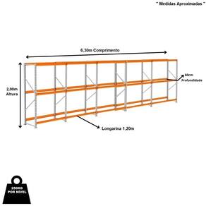 Kit Mini Porta Pallet 250kg Por Nível 1 Inicial + 4 Continuações 6,30m Comprimento 2,00m x 1,20m x 0,60cm O Mini Porta Pallet é produzido em aço resistente, com capacidade de 250kg por nível e reforço nas laterais é indicado para depósitos, estoques e exposição, como: pet shops, oficinas, lojas de materiais de construção e mini atacarejos. Prático e versátil dispensa o uso de empilhadeiras, onde as mercadorias são depositadas e retiradas manualmente. Além disso, é de fácil montagem, com a simples colocação de porcas e parafusos unindo as longarinas às colunas. A pintura dos produtos é feita por meio da técnica eletrostática, com tratamento anticorrosão uniforme e resistente. Dimensões Aproximadas Altura: 2,00mProfundidade: 0,60mComprimento Longarina: 1,20mComprimento Total Montada: 6,30m " Medida Aproximada "Características Material: AçoMarca: AmapáCor: Cinza/Laranja Capacidade por Nível: 250kgPeso Total Suportado: 3750kgFornecedor: Mixmob Instalações Comerciais Contém 06 Laterais 2,00m x 0,60m - Amapá15 Pares Longarinas 1,20m x 0,60m – Amapá Entrega Via: TransportadoraPrazo: Consulte pelo CEP com nossos vendedores Garantia Contra Defeitos de Fabricação: 12 meses DevoluçãoEm até 7 dias após a chegada do produto, você tem o direito de realizar a devolução. Mas para isso, a mercadoria não deve ter sido montada, utilizada e danificada.Horário de AtendimentoSegunda a Sexta-feira, das 13:00h às 17:00h.Dúvidas, Informações, Consulte Nossos Vendedores Via WhatsApp.\nFicha Técnica\nCódigo 1407\nModelo Linha Mini Porta Pallet 250kg\nCategoria Mini Porta Pallet Amapá\nMarca Amapá Metalúrgica\nItens Inclusos 06 Laterais 2,00m x 0,60m - Amapá15 Pares Longarinas 1,20m x 0,60m Amapá\nGarantia 1 ano após o recebimento do produto\nDisponibilidade Disponível em 2 dias úteis\nInformação adicional Dúvidas, Consulte Nossos Vendedores Via WhatsApp.