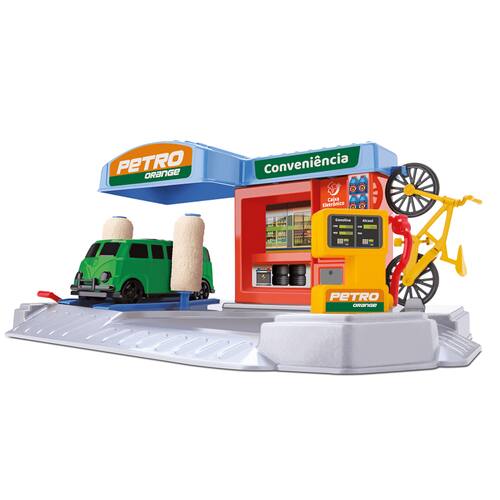 Um incrível posto de gasolina com tudo o que você precisa para cuidar do seu carro! Bomba para abastecer, troca de óleo com elevador, suporte para você pendurar sua bike e uma super conveniência com caixa eletrônico! Você vai passar horas brincando e se divertindo com essa coleção!